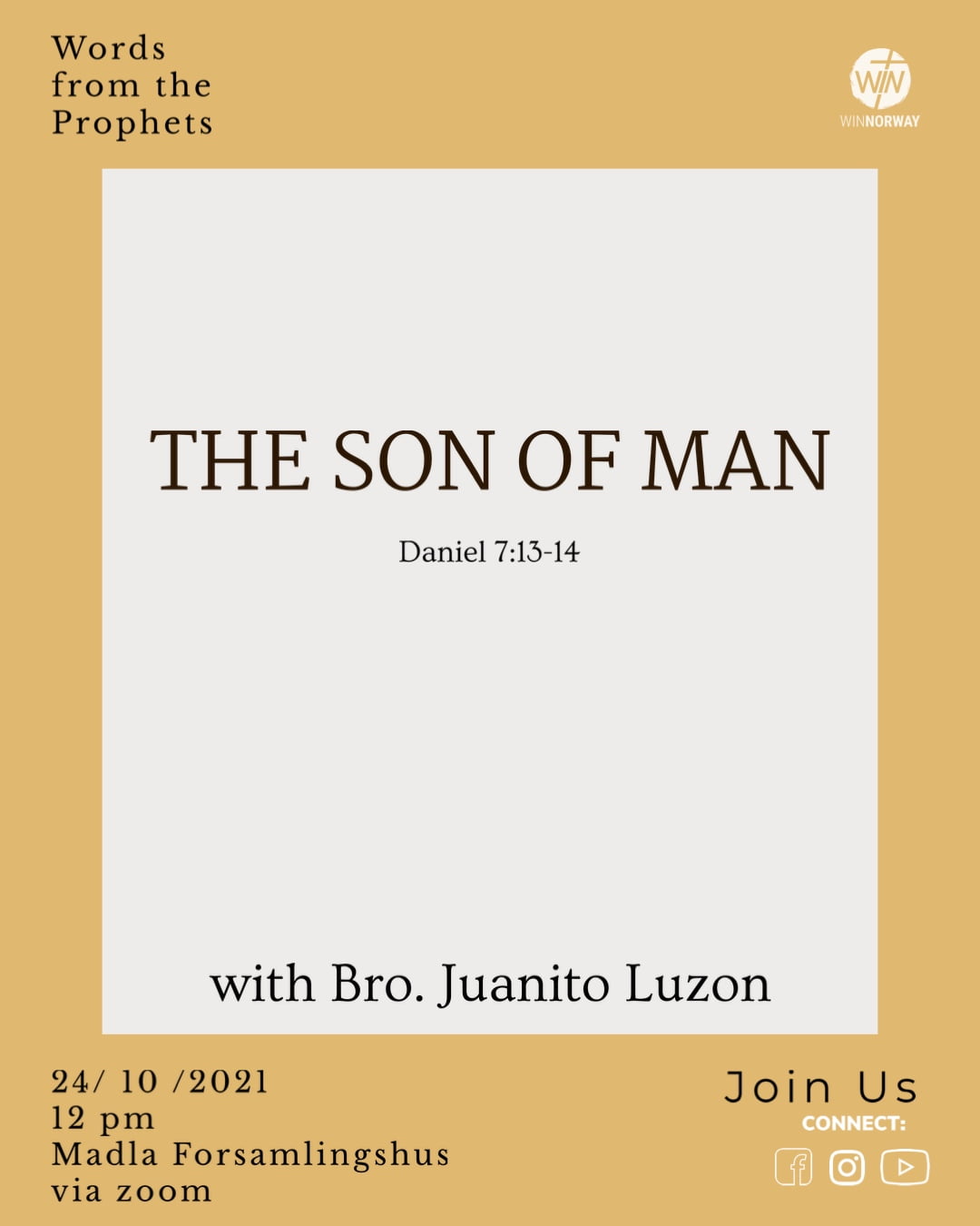 Sunday Service Come and join us every Sunday, 12pm at Madla Forsamlingshus & via zoom. See you and God bless! Zoom link: https://us02web.zoom.us/j/84647138848… MeetingID: 846 4713 8848 passcode: 08082021 + Add to Google Calendar + iCal / Outlook export Date Oct 24 2021 Expired! Time 12:00 pm Share this event Other Events No event found!